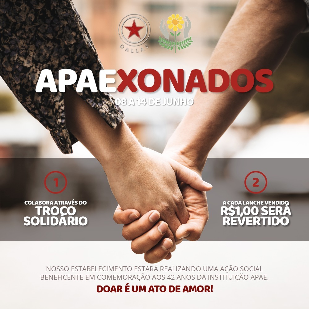 Entre os dias 08 e 14 de Junho, o Dallas vai se transformar num espaço inclusivo. O Dallas APAExonados, é uma iniciativa em parceria com a APAE de Rio Negrinho e na semana que se comemora o amor dos eternos namorados, o estabelecimento estará realizando uma ação social beneficente em comemoração aos 42 anos da instituição. Por isso você pode colaborar através do troco solidário e nós estaremos durante a semana revertendo o valor de R$ 1,00 de cada lanche vendido. Colabore você também. Toda contribuição será bem-vinda e investida com muito amor!