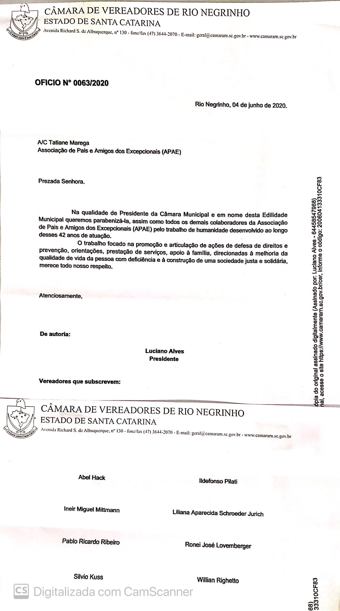 No dia de hoje (09/06/2020) recebemos da Câmara de Vereadora de Rio Negrinho o ofício nº 63/2020, no qual os membros da mesma parabenizam a instituição pelos seus 42 anos.
